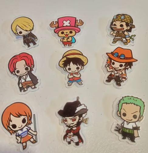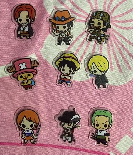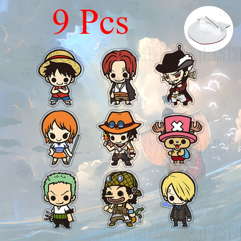 Set da 9 spille in metallo smaltato (enamel pins) ispirate a One Piece con rivestimento, ogni spilla misura indicativamente circa 3-4 cm