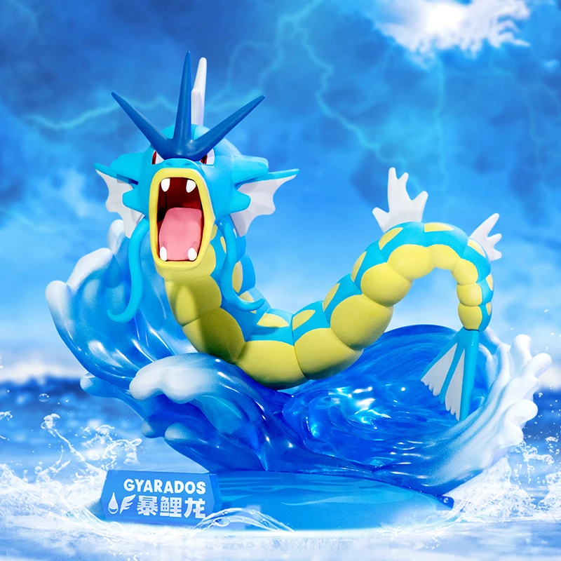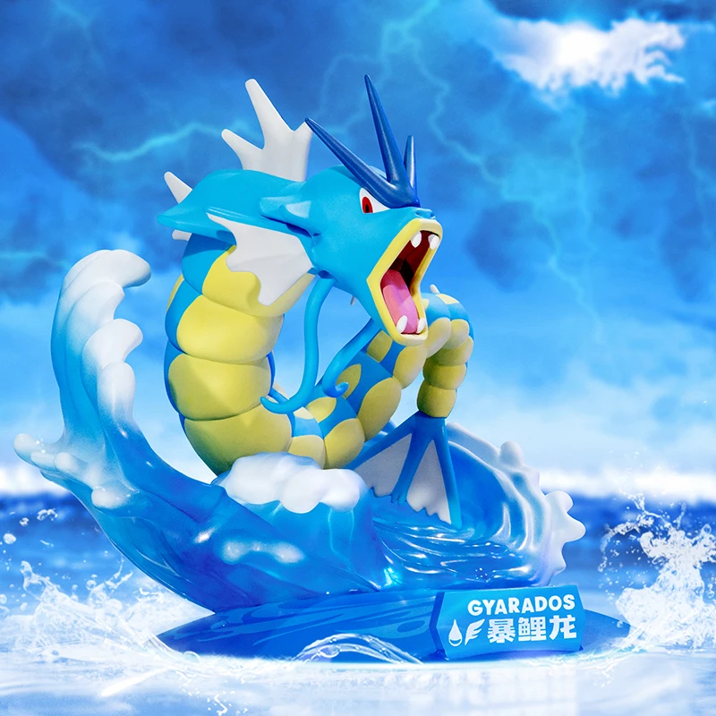La figura di Gyarados è scolpita in modo dinamico, con il corpo serpentino in una posizione che sembra quasi pronta a scattare.
