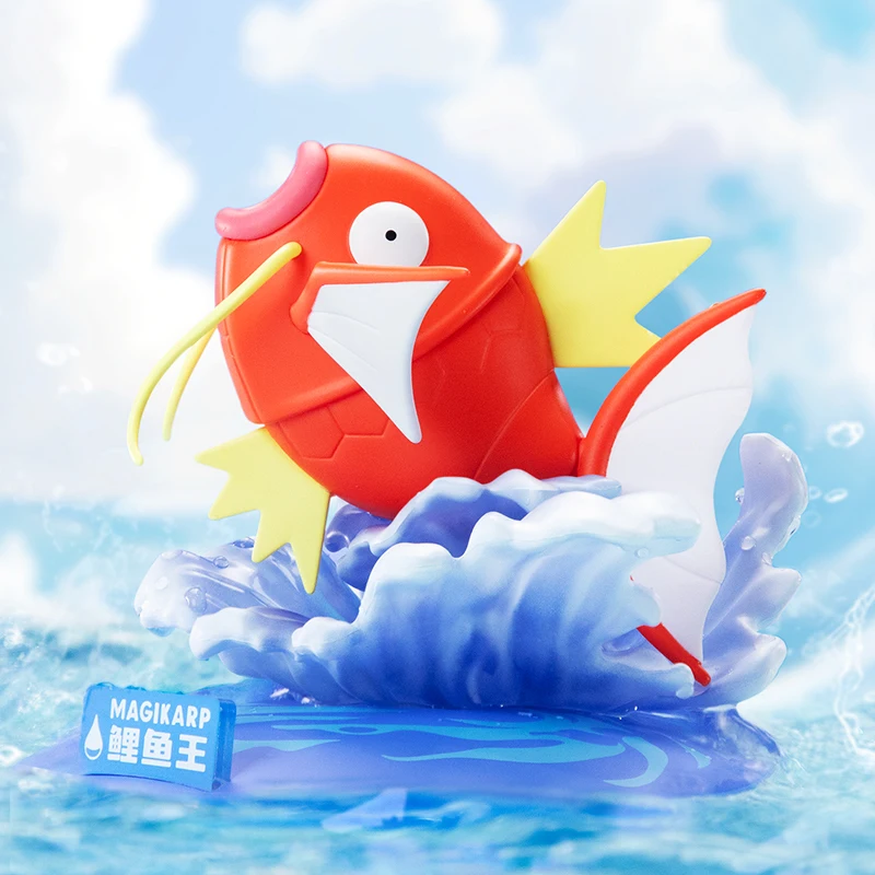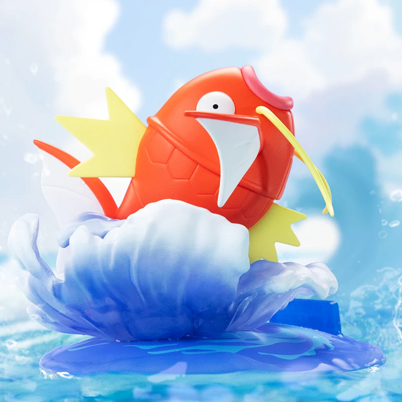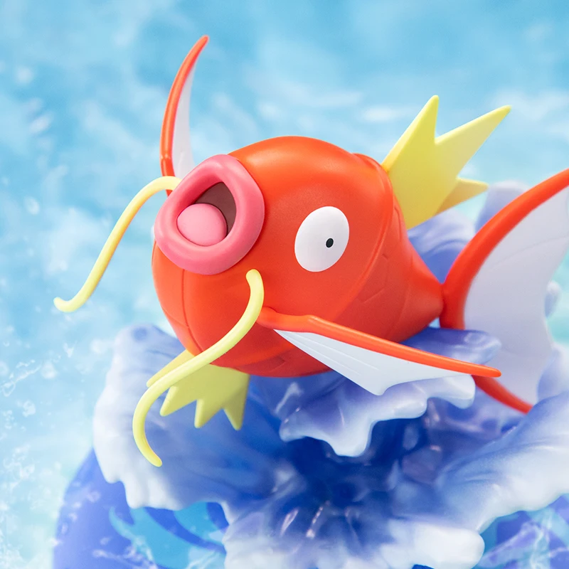 Magikarp è rappresentato nel suo stato tipico, come un pesce floscio, con le sue squame arancioni e un’espressione di innocenza, che evoca la sua natura spesso derisa per la sua scarsa utilità in battaglia.