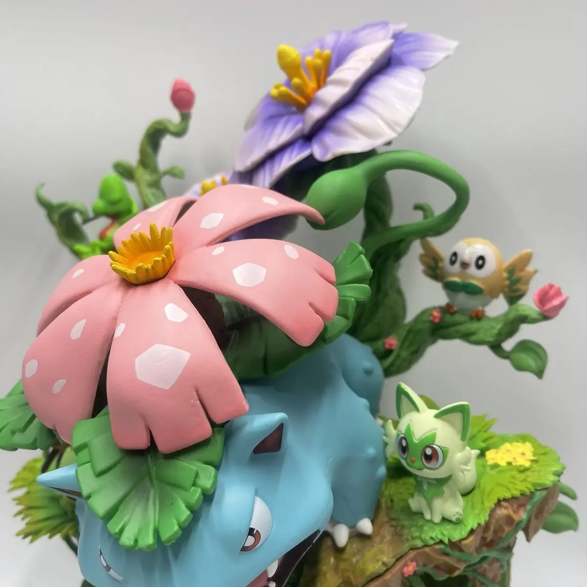 In primo piano mastodontico c’è il re dei Pokemon di tipo erba Venusaur, intorno ne vediamo tanti altri come Bulbasaur, Chikorita, Sprigatito, Rowlet e molti altri ancora.