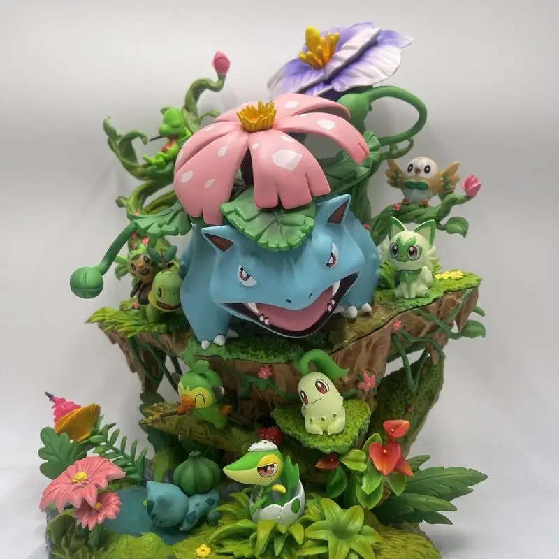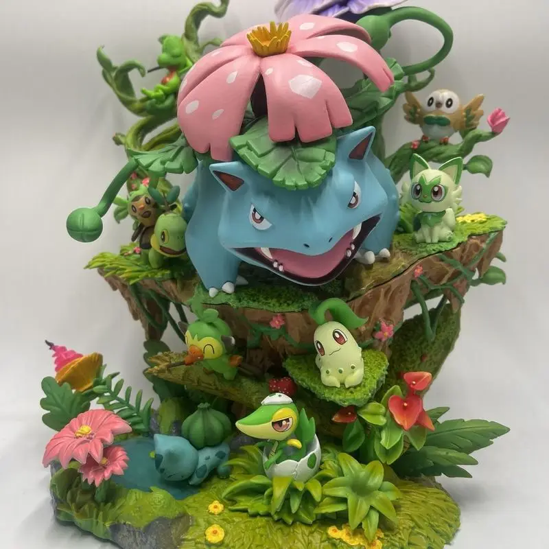 Stupenda action figure che raffigura molti Pokemon erba in un paesaggio conforme rispecchiando il loro tipo